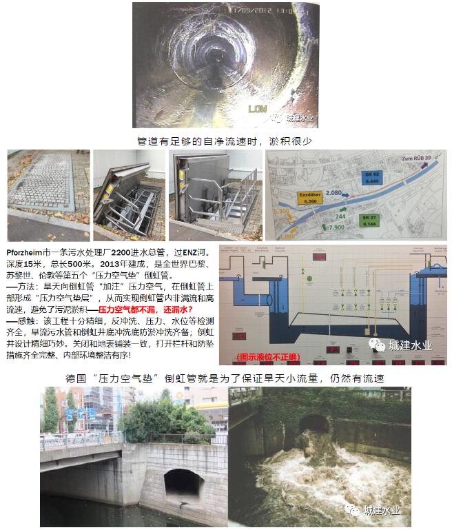 排水管道設(shè)計一定是從末端向起端設(shè)計的,污水、雨水管道要與下游道路污水、雨水管相接、與泵站相接,雨水管甚至要直接接入水體。所以一定要搞清楚相接點基本設(shè)計要素,管徑、坡度、管底高程,更要對下游系統(tǒng)可否接入所設(shè)計管道的設(shè)計水量進行必要的驗算和復(fù)核,可不能夠把管子“一捅了之”。能否把大學(xué)排水工程課本里的“管頂平接”、“水面平接”應(yīng)用到實際情景中,就是基本功的體現(xiàn)。雨水直接排入水體,就一定要說清楚所排入的水體基本情況,如常水位、多年平均高水位、最高水位等。要提醒的是:保證“不淤流速”是排水管道設(shè)計的靈魂,一定要慎用“最小坡度”,特別是在按照遠期流量設(shè)計時,否則就要考慮沖淤措施。德國“壓力空氣墊”的倒虹管就是案例。自流雨水排水口一定要在常水位以上,一定要避免淹沒出流,否則設(shè)計的就不是滿管重力流,設(shè)計方法就錯了。