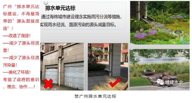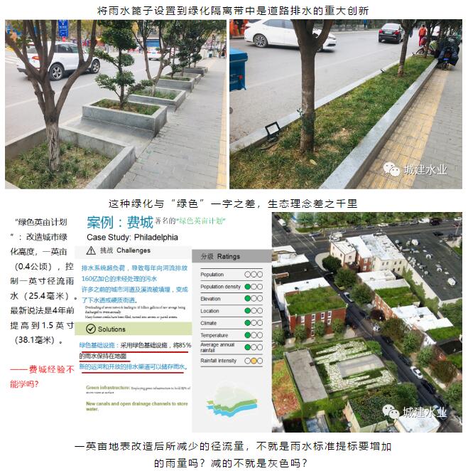 道路排水管道要為將服務(wù)范圍內(nèi)排水對象的污水、雨水有效接入創(chuàng)造條件。自2006年,上海市水務(wù)局在推進第三輪環(huán)保三年行動計劃時,就提出了二級管網(wǎng)(沿道路敷設(shè),服務(wù)于道路兩側(cè)排水戶的排水管道)包括伸出道路紅線一米的支管和支管末端檢查井,以便于三級管網(wǎng)(街坊、小區(qū)、企事業(yè)單位內(nèi))排水管道的接入。現(xiàn)在看來,無疑是對實現(xiàn)污水全收集是正確和合理的。另外為了應(yīng)對雨水排水標準提高,有兩個做法,一是做“加法”,二是做“減法”。“加法”不單是按照新的標準加大道路雨水管管徑,更重要的是要按照新的雨水標準把雨水篦子和連管設(shè)置好,要讓雨水系統(tǒng)能夠做到(雨水口)“嘴巴喝得進”、(連管)“嗓子進得去”、(道路雨水管)“腸子不梗阻”、(雨水排口)“排口排得出”。一定要記住脫離雨水收集口的雨水排水設(shè)計是不完整的雨水排水設(shè)計?!皽p法”就是做好LID,利用“海綿措施”把徑流量減下來,“減法”實際上也是對“進口”一種創(chuàng)新設(shè)計。將道路綠化隔離帶、人行道、小區(qū)內(nèi)部、屋頂進行海綿化改造和設(shè)計,這就是創(chuàng)建“海綿城市”的具體行動,這就是城市工程海綿化。圖中美國費城的“綠色英畝計劃”案例就證明,“減法”是雨水排水提標的重要手段。做好“減法”還會收到一個非常好的效果,那就是有效減少了“徑流污染”,這是實現(xiàn)城市水體“下雨不黑”的最有效措施。“減法”體現(xiàn)的是“綠、灰”相結(jié)合,體現(xiàn)的是“優(yōu)先考慮更多利用自然力量排水”。廣州利用綠色措施實現(xiàn)“排水單元達標”就是對雨污混接改造工作的創(chuàng)造性發(fā)展。很多城市雨水排水規(guī)劃、設(shè)計文件為體現(xiàn)海綿城市創(chuàng)建和提標,不談綠色措施,而簡單地將“綜合徑流系數(shù)”調(diào)整0.6是不科學(xué)、不現(xiàn)實和不負責(zé)任的做法。